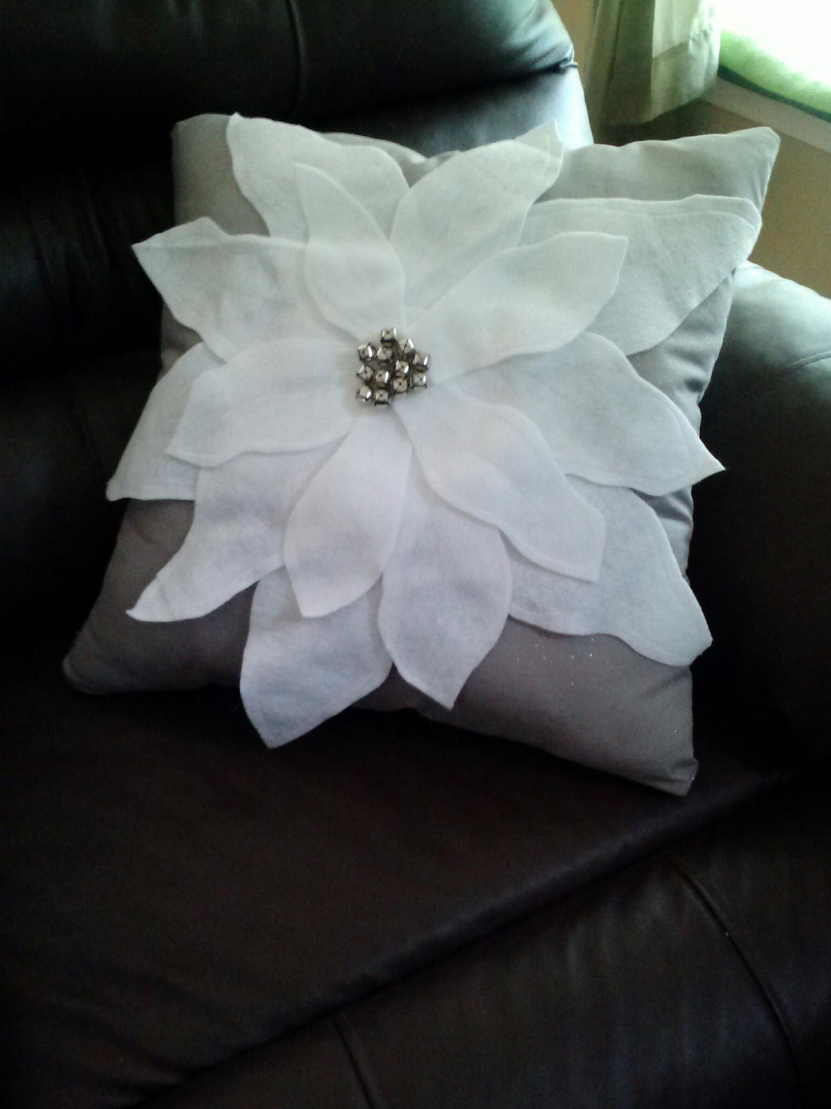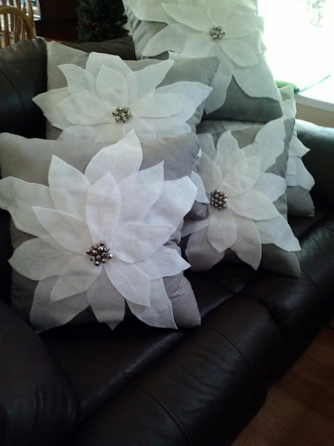 When I saw this tutorial for Pottery Barn Poinsettia Pillows by Crafting in the Rain (on Pinterest, of course!) I knew I had to make them. I made five pillows for a Holiday craft exchange party and everyone loved them. I used a light grey sparkly fabric for my pillow, white felt for the petals, and silver jingle bells for the center. I added an extra detail - I outlined my petals and sewed a line down the middle. It was the perfect finishing touch.